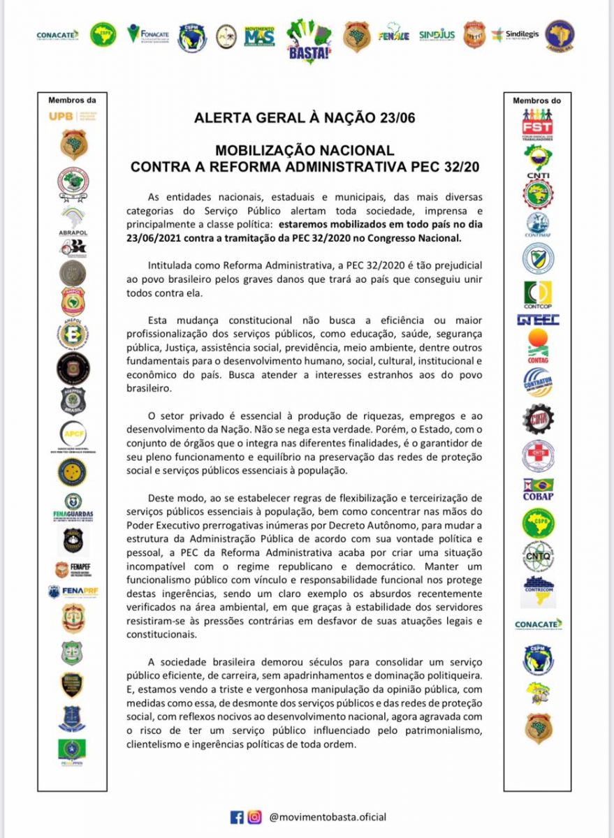 ALERTA GERAL À NAÇÃO 23/06 - MOBILIZAÇÃO NACIONAL CONTRA A REFORMA ADMINISTRATIVA PEC 32/20