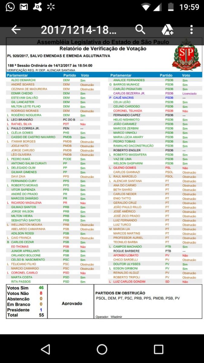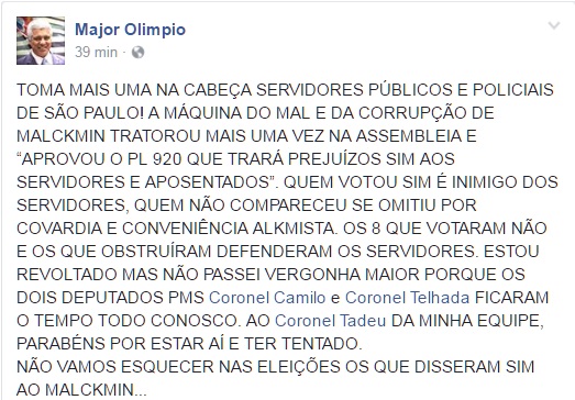 O Governo Alckmin usando de absurda falta de respeito com todo funcionalismo público e da polícia civil aprovou na calada da noite de ontem (14/12/2017) com o apoio da grande maioria dos deputados da ALESP o PL 920/17 que congela os salários e benefícios de todo funcionalismo público por 2 anos, como se já não bastasse os 4 anos que estamos sem reposição salarial o que impacta em nossa folha uma redução de aproximadamente cinquenta por cento em nosso salário durante este período. Precisamos conscientizar a todos que esse Governo não pode mais nos representar em qualquer área de Governo, seja Federal, Estadual e Municipal, mas para isto precisamos da união de todos para divulgarmos por todo o País o quanto estamos sendo massacrados, e também não podemos esquecer que este projeto só foi aprovado porque teve o aval da grande maioria dos deputados da ALEP, e portanto, temos que gravar o nome de todos os deputados estaduais que votaram a favor do Governo que de forma inescrupulosa fez do nosso salário moeda de troca com o Governo Federal para prorrogação de dívidas do Estado com a União a qual não somos devedores e não podemos pagar esta conta.