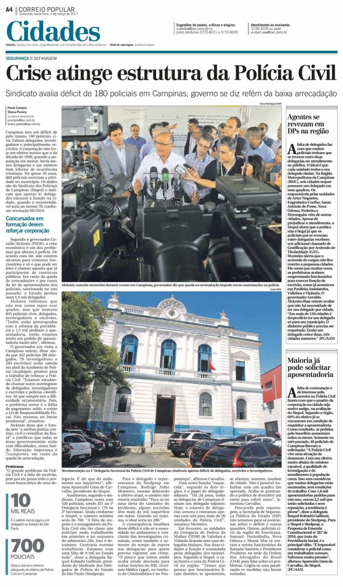 Em matéria de página inteira do Correio Popular de Campinas, um dos jornais de maior circulação em todo Estado de São Paulo, o presidente da FEIPOL SUDESTE e do SINPOL de CAMPINAS e REGIÃO, Aparecido Lima de Carvalho, Kiko, fala da crise que atinge a Polícia Civil paulista, cada vez mais encolhida em seu contingente, o que traz acúmulo de trabalho e desmotiva os profissionais, que sequer recebem a reposição da inflação nos salários desde 2014.