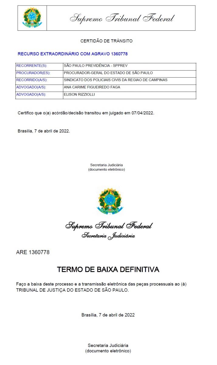 Informamos a todos os policiais civis de Campinas e região que na data de ontem 07/04/2022 o Supremo Tribunal Federal expediu certidão de trânsito em julgado de mandado de segurança, ajuizado por este sindicato, que concede o direito aos policiais civis de nossa base territorial para não exigência de cinco anos na classe na data de sua aposentadoria. O mandado de segurança também restitui o direito daqueles policiais civis que perderam a classe quando se aposentaram em decorrência da exigência pelo governo de São Paulo, e desta forma o Sinpol Campinas através de seu departamento jurídico e com embasamento nas decisões das três instâncias do poder judiciário, irá restabelecer a classe dos policiais civis de nossa base territorial, embasada na decisão do STF, bem como irá buscar a restituição dos valores descontados indevidamente durante todo o período que retroagiu de classe, ou seja da data de sua aposentadoria até o êxito, bem como a restituição da classe.