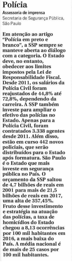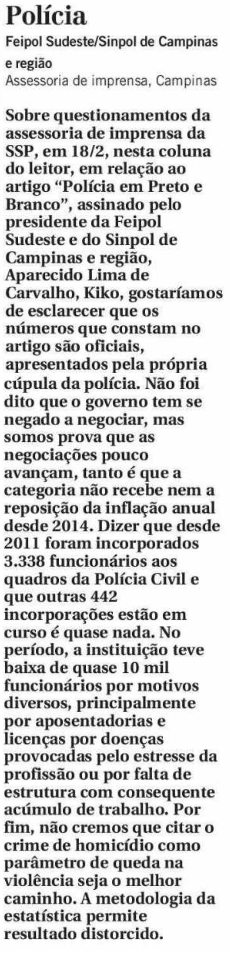 Na publicação desta quinta-feira (23/2), a Assessoria de Imprensa da FEIPOL SUDESTE e SINPOL de CAMPINAS e REGIÃO informou o seguinte: “Sobre questionamentos da Assessoria de Imprensa da SSP, em 18/2, nesta Coluna do Leitor, em relação ao artigo “Polícia em Preto e Branco”, assinado pelo presidente da FEIPOL SUDESTE e do SINPOL de CAMPINAS e REGIÃO, Aparecido Lima de Carvalho, Kiko, gostaríamos de esclarecer que os números que constam no artigo são oficiais, apresentados pela própria Cúpula da Polícia.