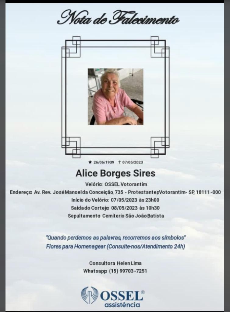 E COM PROFUNDO PESAR QUE NOTICIAMOS O FALECIMENTO DA GENITORA DE NOSSO AMIGO E FILIADO WILSON SIRES E FICA REGISTRADO NOSSOS VOTOS DE PESAR A TODA FAMILIA ENLUTADA