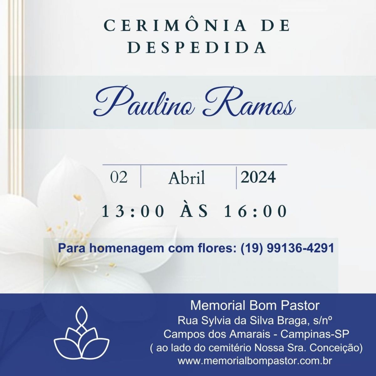 É com profundo pesar que noticiamos o falecimento do Sr. PAULINO RAMOS, falecido no dia 01/04/2024, Pai do nosso Filiado PAULO SERGIO RAMOS ( GUGA) Investigador de Policia aposentado