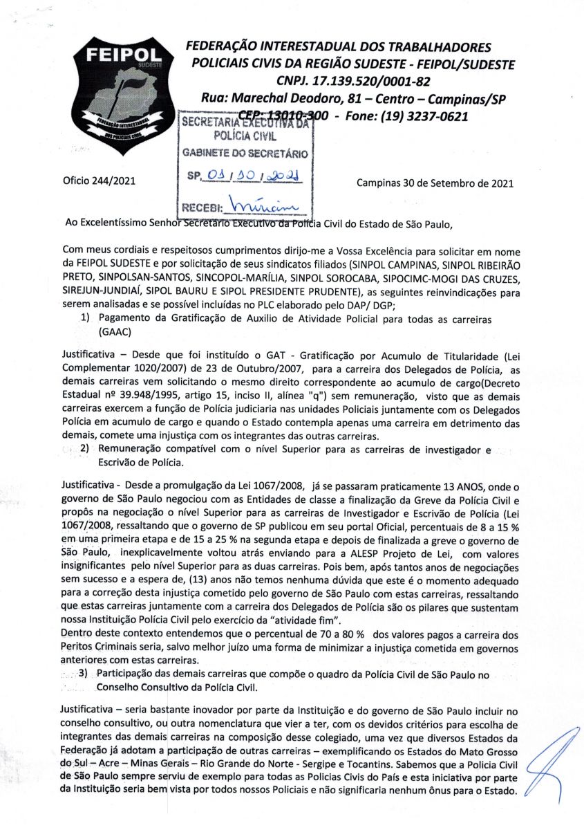 Encaminhamos ofício 246/2021 com o mesmo teor ao Excelentíssimo Senhor Diretor do DAP Doutor Gilson Cezar Pereira da Silveira, que foi designado para elaboração de PLC pelo Delegado Geral de Polícia.