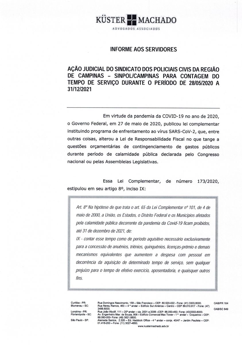 Informamos a todos os policiais de Campinas e região que para garantir seu direito a continuação de contagem de tempo de serviço (quinquênio), sexta-parte e licença prêmio, após decisão judicial, os interessados deverão estar filiados ao sindicato.