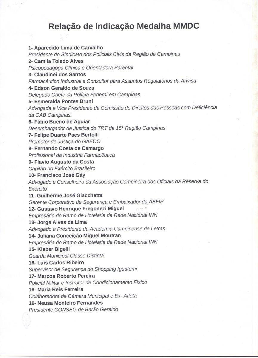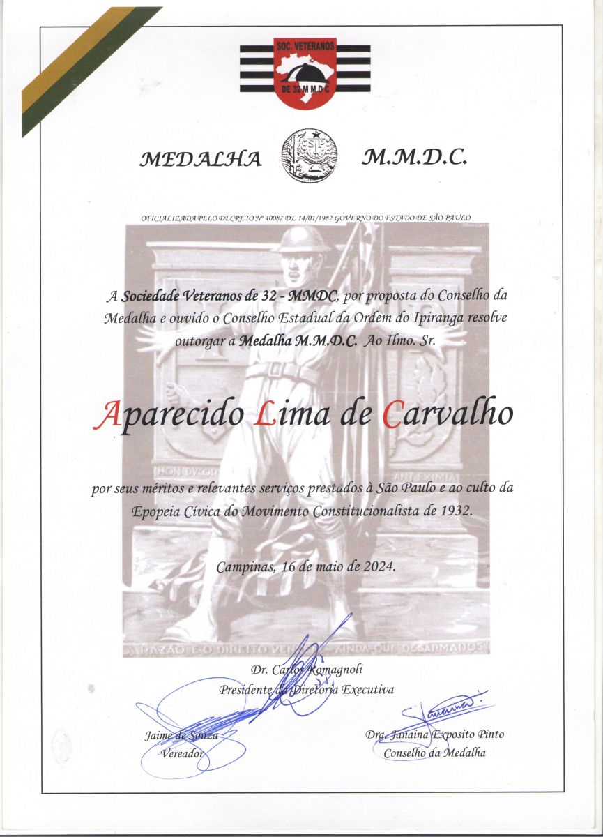O Presidente do Sinpol Campinas Aparecido Lima de Carvalho (Kiko), foi homenageado com a Medalha M.M.D.C em sessão solene da câmara Municipal de Campinas no dia 16/05/2024, juntamente com diversas autoridades e pessoas que se destacaram por méritos de relevantes serviços prestados a São Paulo e ao culto da Epopeia Cívica do Movimento Constitucionalista de 1932.