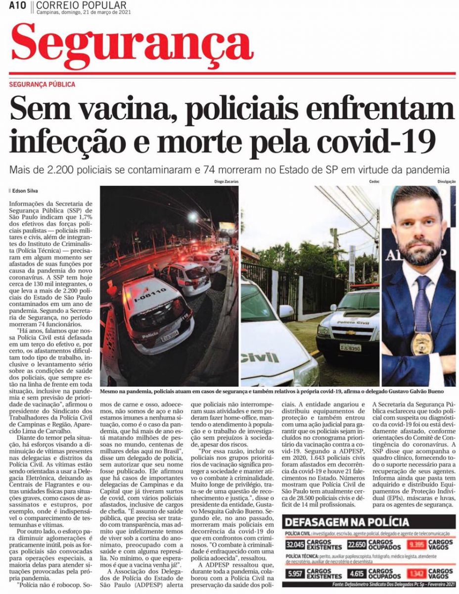 SEM VACINA, POLICIAIS ENFRENTAM INFECÇÃO E MORTE PELA COVID-19 - MATÉRIA PUBLICADA NO JORNAL CORREIO POPULAR DIA 21/03/2021