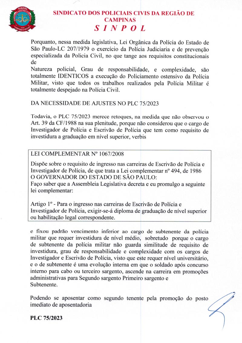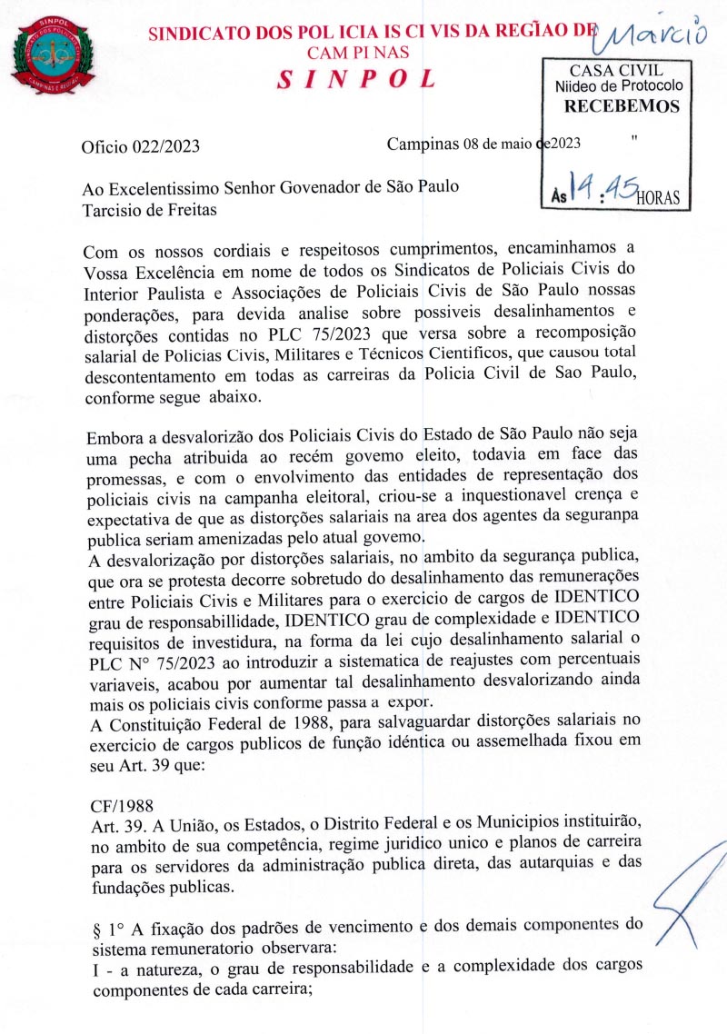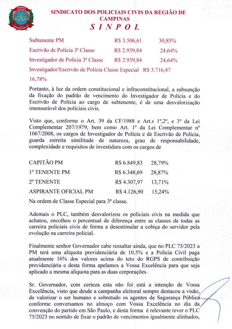SINPOL CAMPINAS E ENTIDADES PARCEIRAS PROTOCOLAM OFICIO AO GOVERNADOR TARCÍSIO DE FREITAS SOLICITANDO CORREÇÃO DAS DISTORÇÕES DO PLC 075/2023