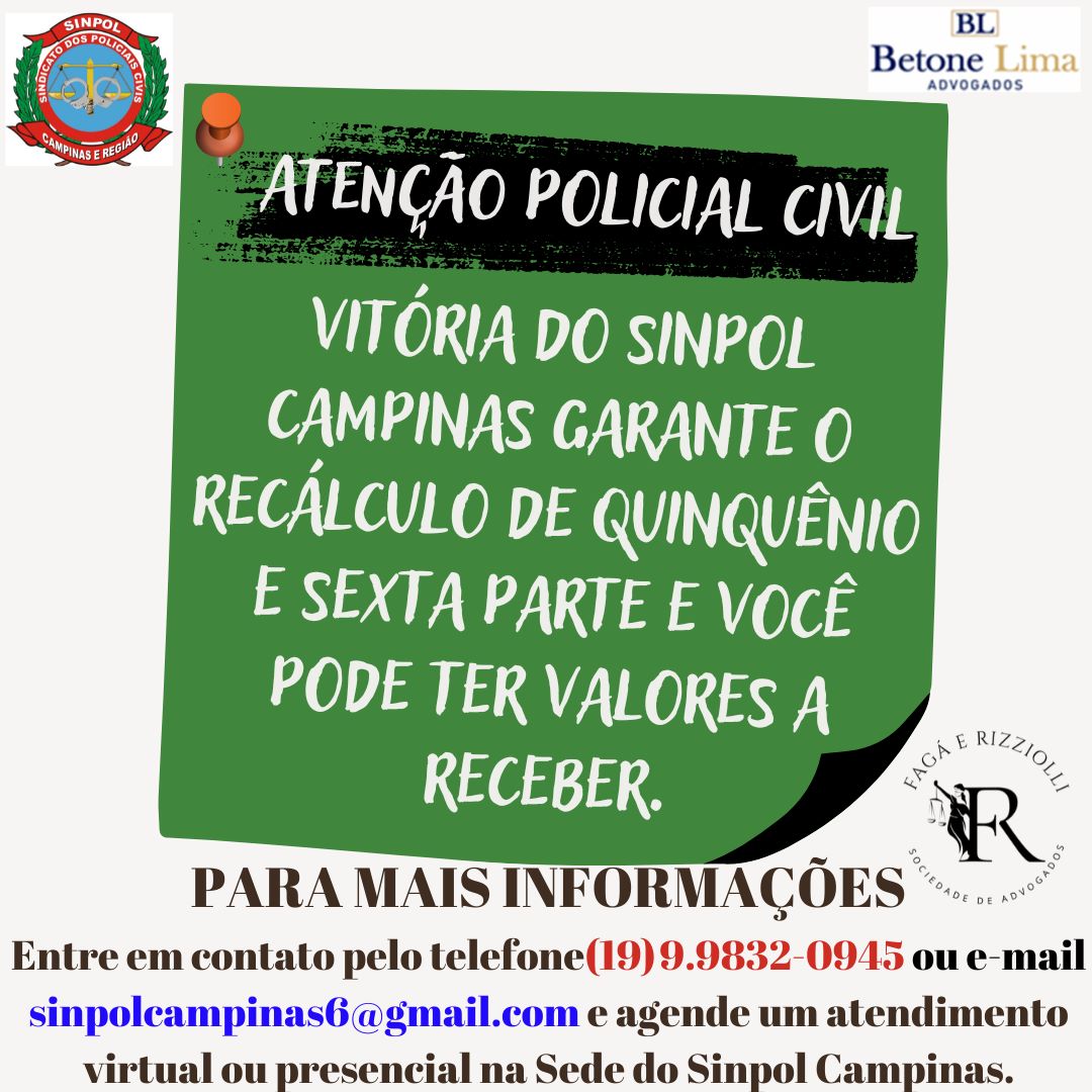 SINPOL CAMPINAS OBTÊM EXITO EM AÇÃO DE QUINQUÊNIO E SEXTA PARTE PARA POLICIAIS CIVIS.